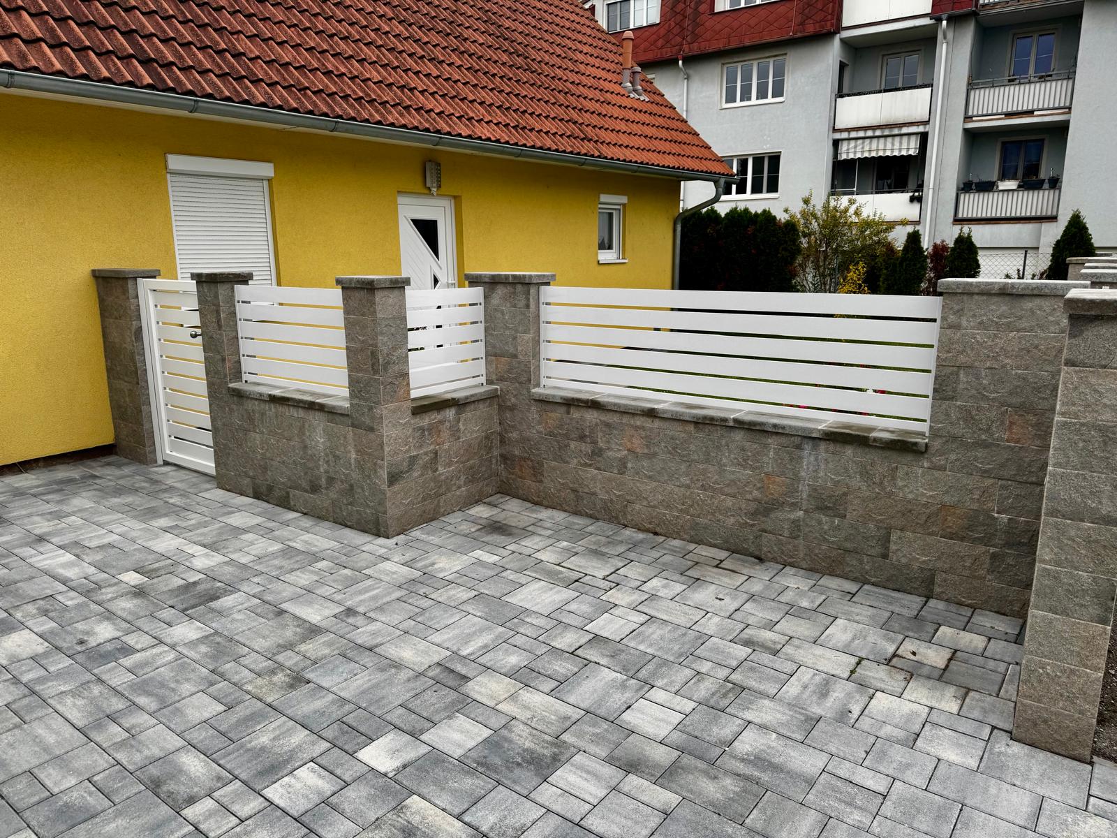 Zur Anlage gehören außerdem zwei stabile Aluminium-Gehtüren, die perfekt in das Gesamtkonzept integriert sind. In Kombination mit den massiven Steinpfeilern entsteht ein edler und langlebiger Eingangsbereich, der sowohl optisch als auch funktional überzeugt.